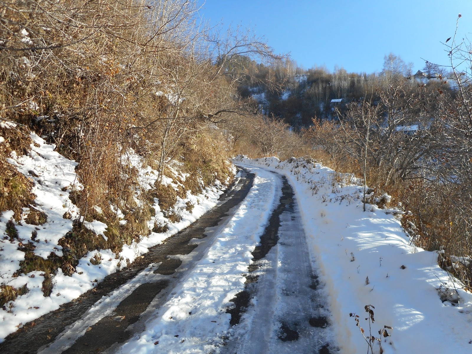Having spent enough time in downtown to feel like I'd be wasting time by exploring further there, today I ventured back into the hills. Without too much information to go on, I hopped onto bus 5 and held on till the last stop. The route went as though it was going toward Medeu until hanging a right onto a curvy one lane road; from this point it was a couple of minutes before rising out of the hotels and restaurants up into a snowy suburban community of poor Kazak hill dwellers.